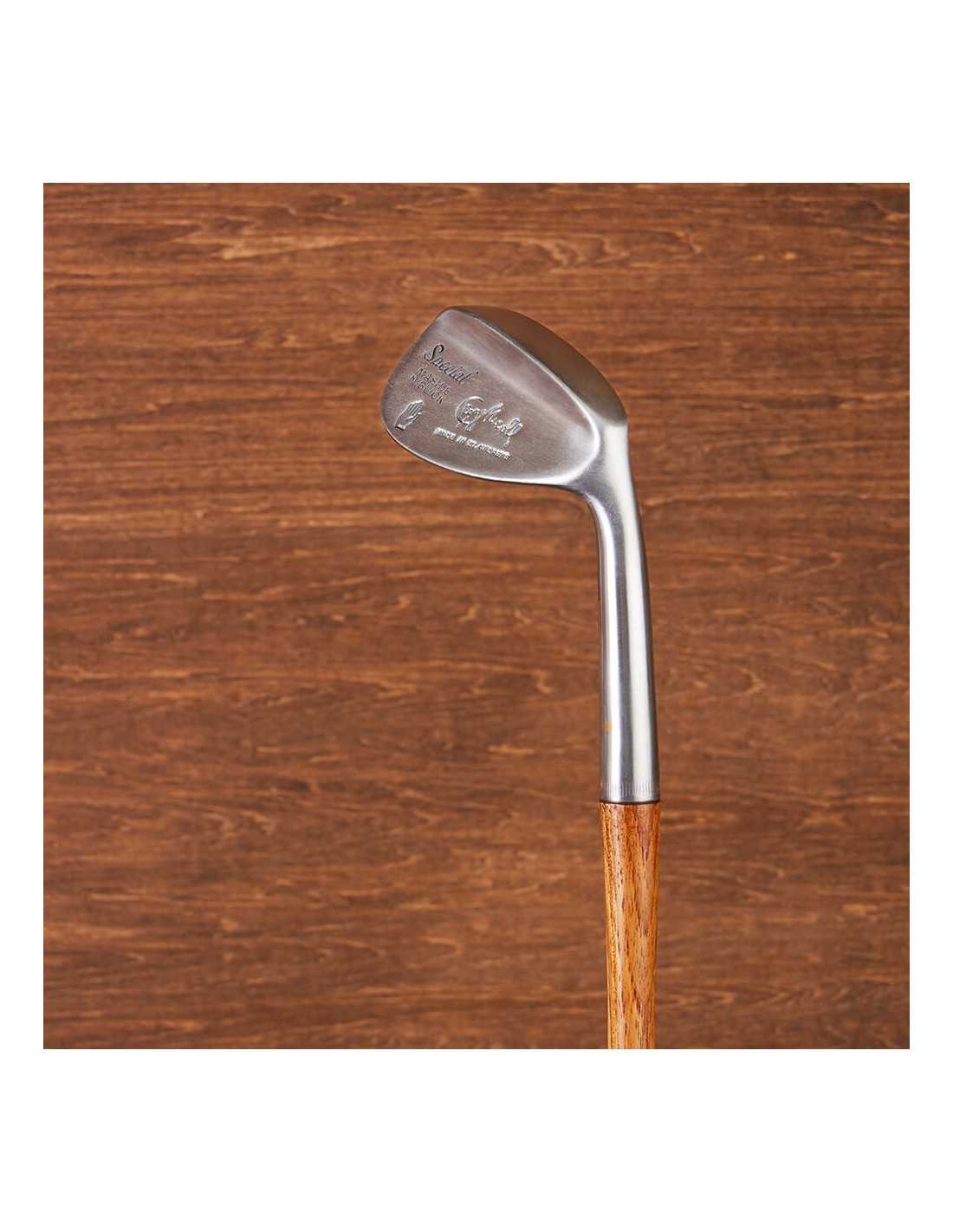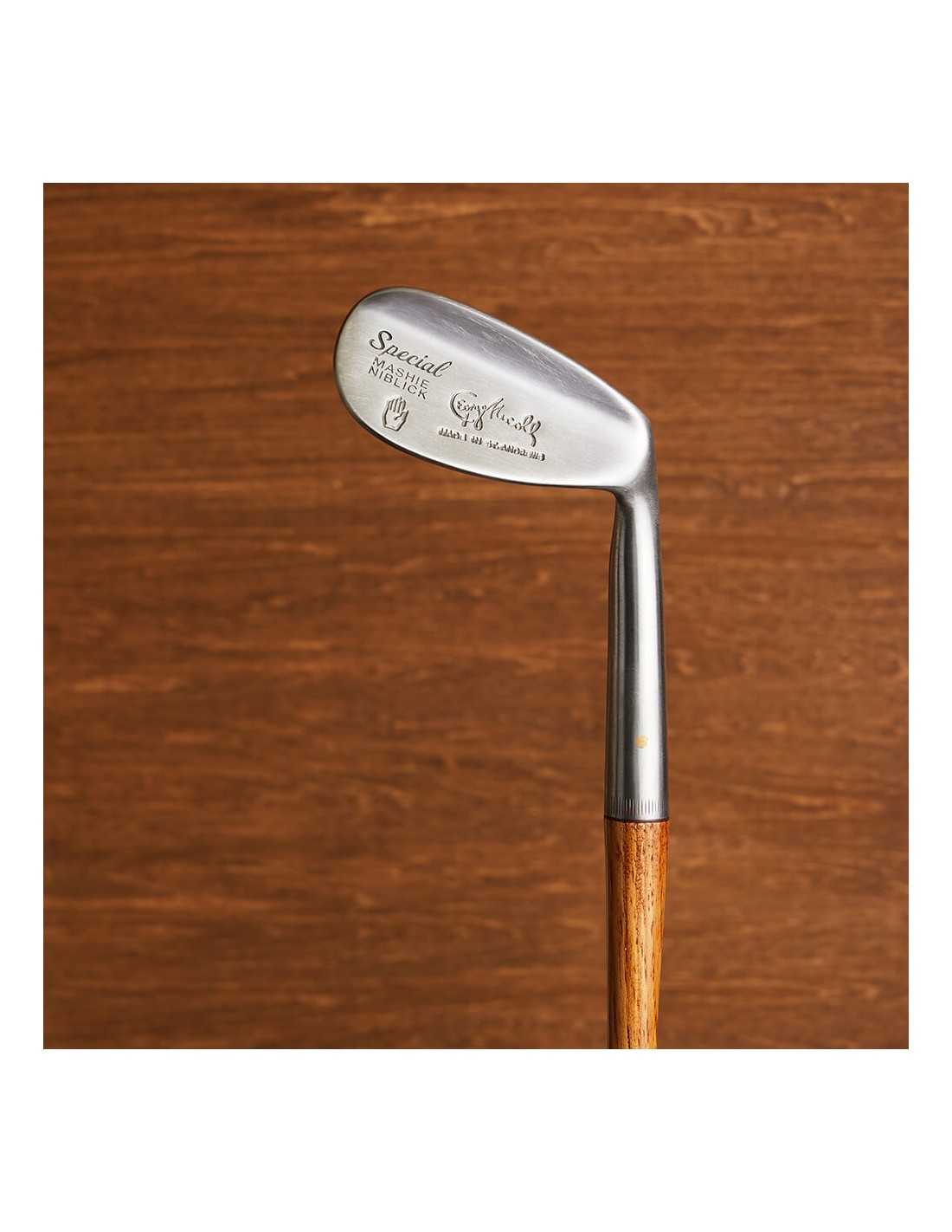 This hickory golf Mashie Niblick (45°) iron is inspired by the 1920s-style George Nicoll hickory golf clubs. George Nicoll aimed to make golf more accessible, designing clubs that were easy to play with and marking them with his famous 'Hand' cleek symbol, known as 'The Helping Hand of Golf.' Ideal for beginners due to their ease of use, they also offer the precision needed for skilled players. The dot face, flange, and bounce design help players get the most out of their hickory golf experience.