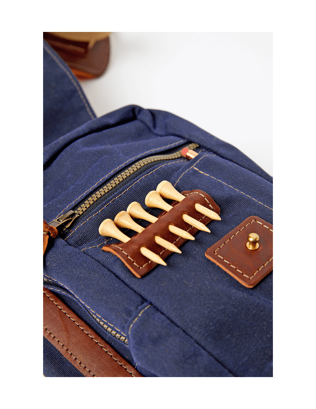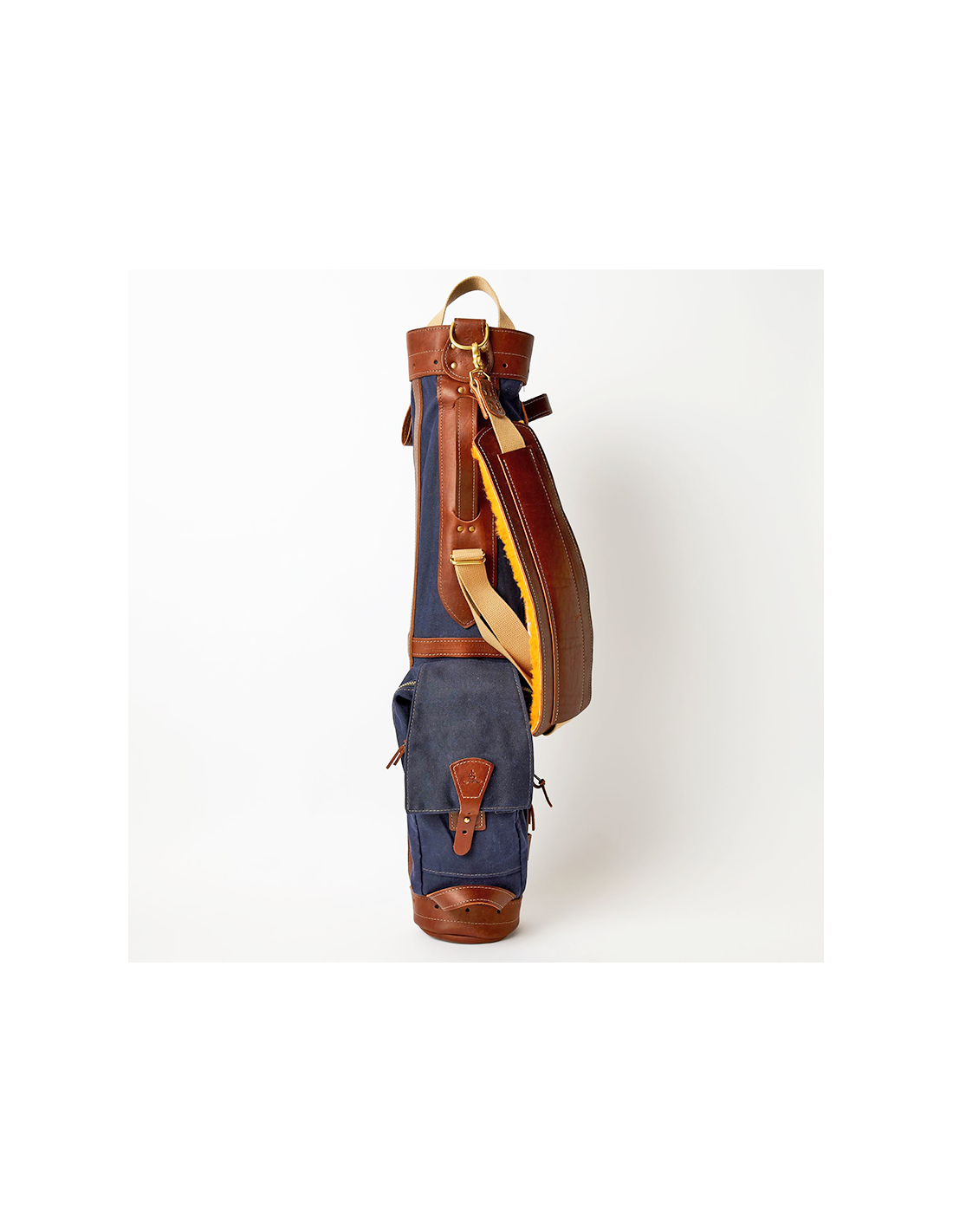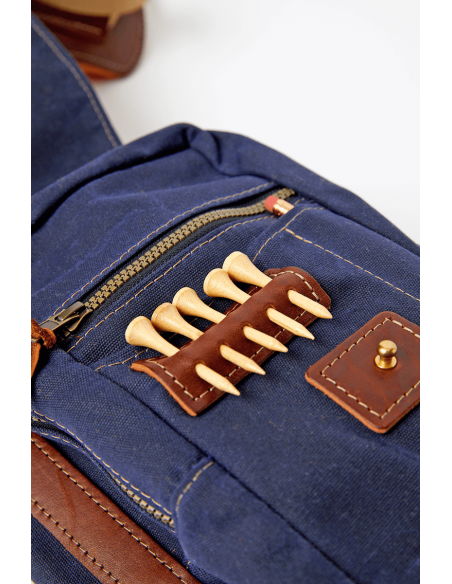 このゴルフヒッコリーゴルフ1920年代スタイルの丈夫なワックスキャンバス、レザー、金具部分には真鍮を使用して米国で手作りされたゴルフバッグ。この直径6インチのゴルフバッグには、ゴルフクラブが最大10本まで入る十分なスペースがあります。オークの棒でサポートされており、傘ホルダー、タオルフープ、ボトムハンドル(持ち運びの位置を簡単に調整できる)、ソフトストラップが付いています。ジッパー式フロントポケットには、ゴルフボールやその他のゴルフアイテムを収納するのに十分なスペースがあり、ティーホルダー、スコアカード、鉛筆ホルダーも付いています。高品質な素材から手作りされており、経年変化もお楽しみいただけます。このバッグはネイビーブルーの色です。