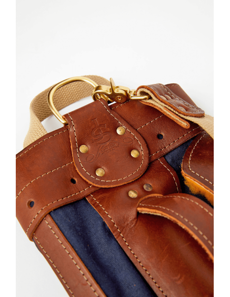 このゴルフヒッコリーゴルフ1920年代スタイルの丈夫なワックスキャンバス、レザー、金具部分には真鍮を使用して米国で手作りされたゴルフバッグ。この直径6インチのゴルフバッグには、ゴルフクラブが最大10本まで入る十分なスペースがあります。このバッグはネイビーブルーの色です。