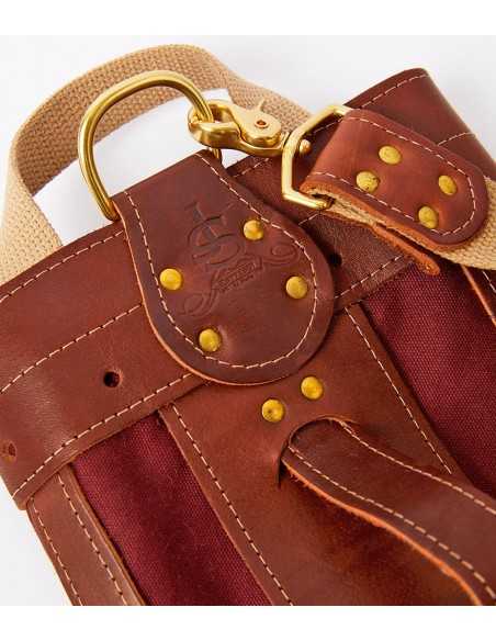このゴルフヒッコリーゴルフ1920年代スタイルの丈夫なキャンバス、レザー、金具部分には真鍮を使用して米国で手作りされたゴルフバッグ。この直径6インチのゴルフバッグには、ゴルフクラブが最大10本まで入る十分なスペースがあります。このバッグはバーガンディーです。