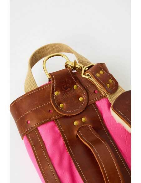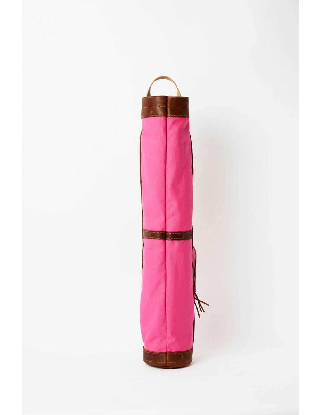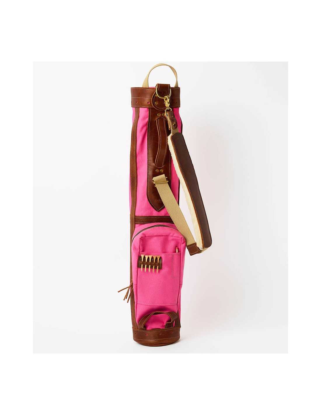 このゴルフヒッコリーゴルフ1920年代スタイルの丈夫なキャンバス、レザー、金具部分には真鍮を使用して米国で手作りされたゴルフバッグ。この直径6インチのゴルフバッグには、ゴルフクラブが最大10本まで入る十分なスペースがあります。このバッグはピンクのキャンバス地とタンの革です。