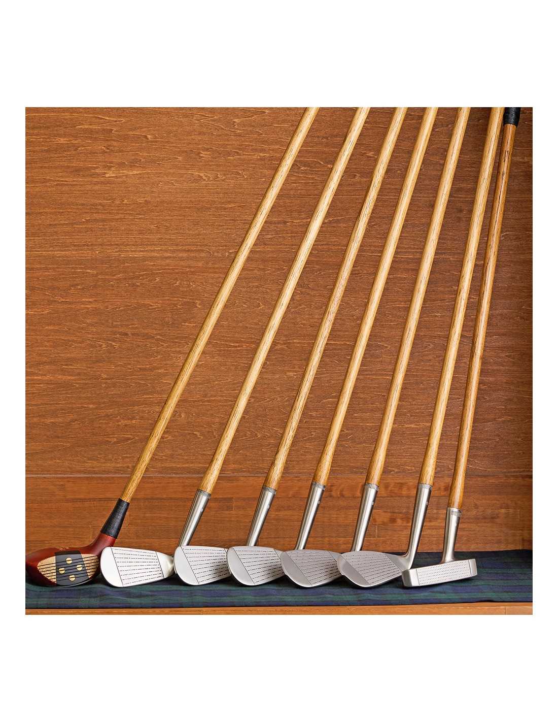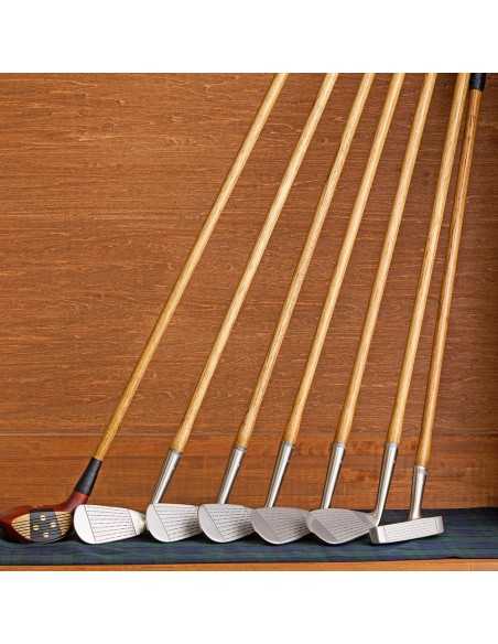 この7本組アイアンセットは、タッド・ムーアがデザインし、1930年代のパル・マルウッド、ギブソン・スターOAアイアン、チコピー・パターに着想を得たモデルです。タッド・ムーア製ヒッコリーシャフトとレザースタイルグリップを装着。初心者からプロまで世界中のヒッコリーゴルファーに愛されており、ウッド1本とパターを加えてもペンシルバッグで軽快に持ち運べます。