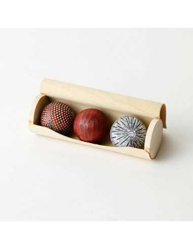ガタパーチャゴルフボールセレクションはガタパーチャボール3個(スムース、ハマード、ブランブル模様)のディスプレーです。ガタパーチャは木の樹液という意味を持つマレーシアの語句で、元々はサポジラの木から派生します。サポジラはアカテツ科で、中央、南アメリカ、特にメキシコのユカタン半島やコスタリカに土着する植物です。しかし今では、マレーシア、インド、西インド諸島を含む世界の熱帯地域で見られます。最初は、マレーシアで短剣やナイフの柄に使われていたのが発見されました。その物質はとても硬く、しかし熱湯に浸すととても柔軟でした。これらのボールは趣ある木製の筒に入っており、ボールの簡単な歴史の記述も付いています。この製品はすべてスコットランドで作られ、本物のガタパーチャボールに忠実に作られています。これらのボールでプレーも可能です。サイズは長さ14cm、高さ4.5cmです。